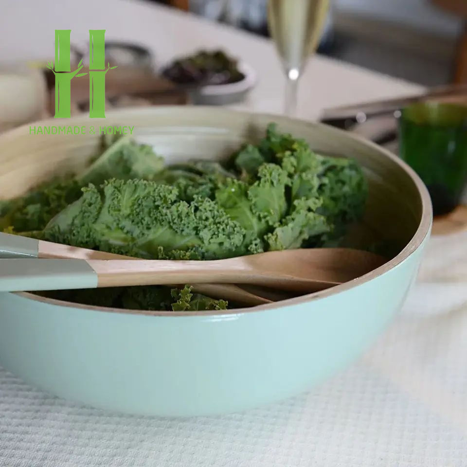 Cuenco redondo de bambú para servir ensalada superventas, cuenco al por mayor de vajilla, plato de colores, embalaje personalizado OEM hecho a mano en Vietnam HNH