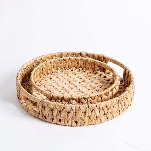 Bandeja de almacenamiento más vendida, jacinto de agua ecológico, tejido nórdico de mimbre, manijas de bandeja de frutas tejidas para bebidas caseras
