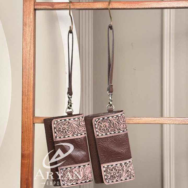 Cartera de mano de cuero mecanizada a mano de estilo occidental superventas, cartera de mano de cuero genuino Floral en relieve, tarjetero, monedero