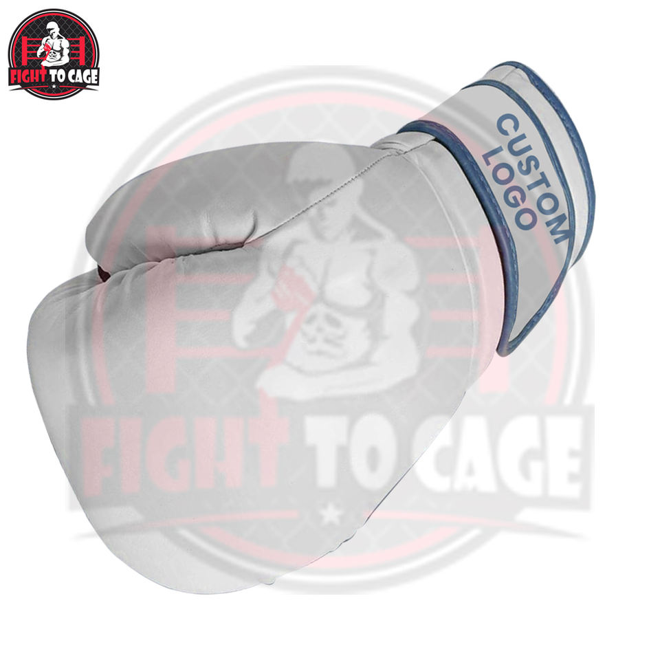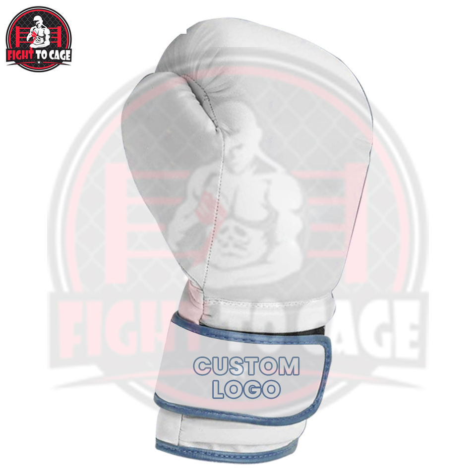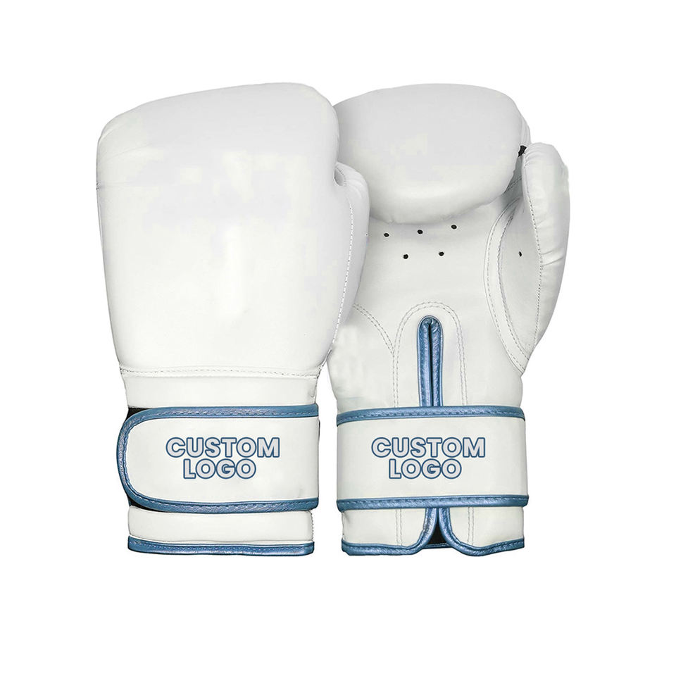 Guantes de Boxeo Personalizables Transpirables y Absorbentes de Impactos de Alta Calidad en Cuero Blanco y Azul con Protección para las Manos