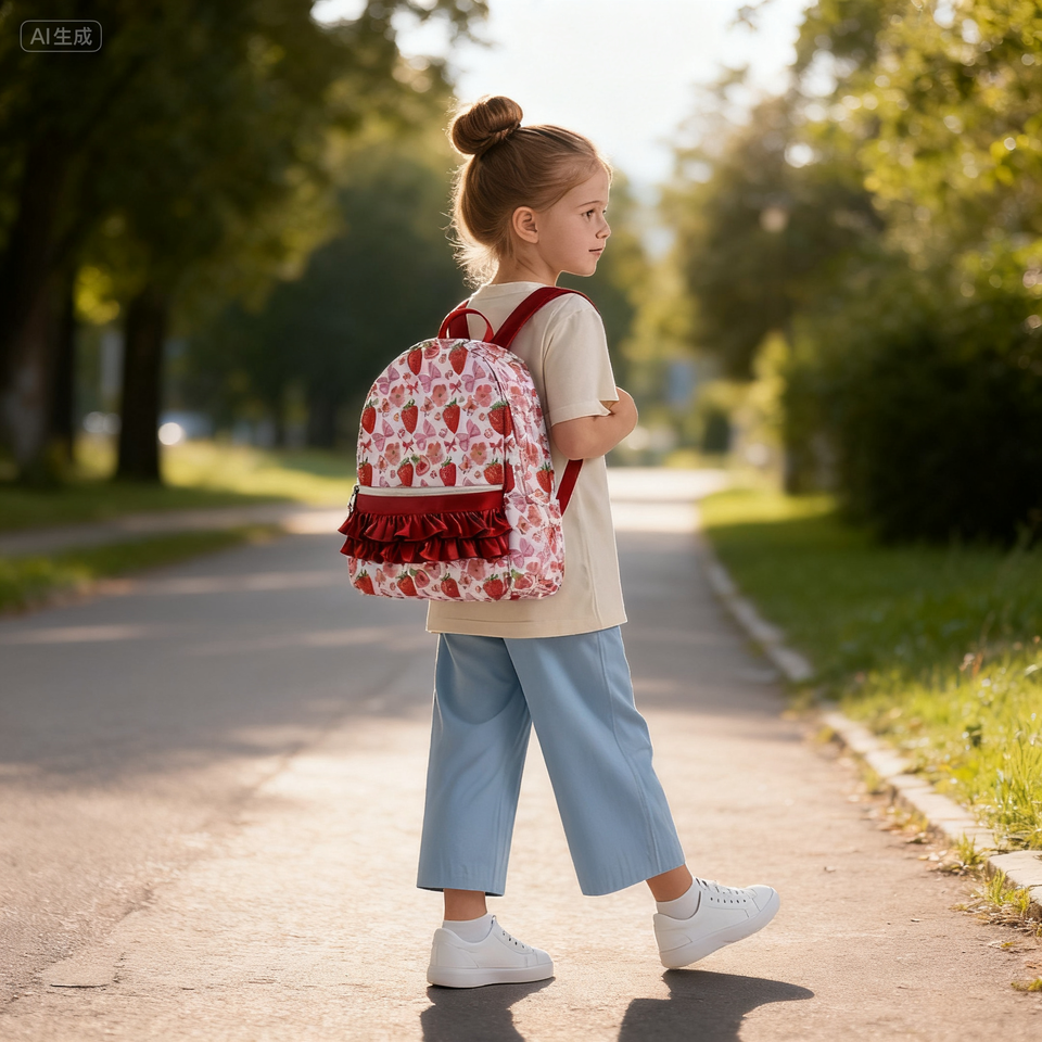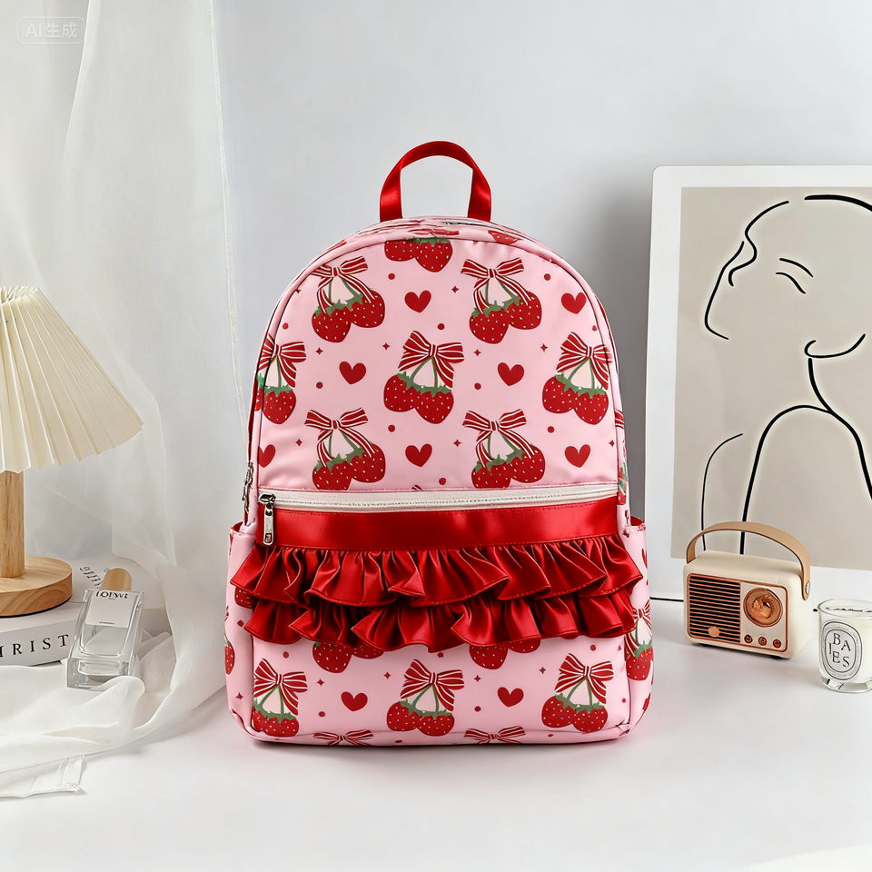 Mochila más vendida con patrón de fresa Mochila informal para chicas adolescentes, mochila escolar de nailon impermeable con volantes
