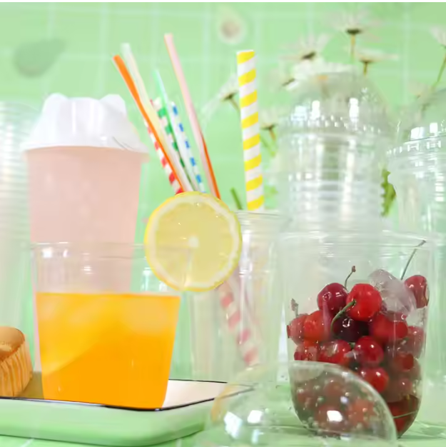Taza plástica REDONDA/PET/alimentos y bebidas contiene/paredes simples con tapa