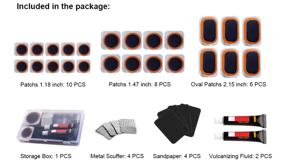 Función:Kit de reparación de neumáticos, parches fríos para reparación de neumáticos, desmontador de neumáticos