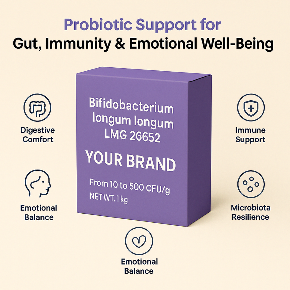 Bifidobacterium longum longum LMG 26652, Ingrediente de Polvo Probiótico, Grado Certificado, Cepa Cruda para Uso en Suplementos, Fabricación Industrial
