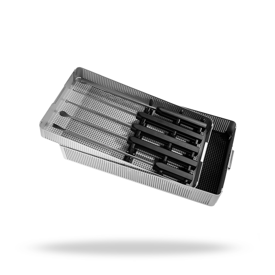 Acero inoxidable de alta calidad, resistente a la corrosión, totalmente autoclavable, con diseño perforado para una máxima eficiencia de esterilización.