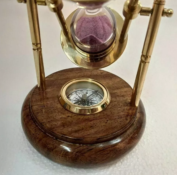 Gran descuento, temporizador de arena de latón, reloj de arena con brújula náutica giratoria, Base de madera marina, por exportadores de India