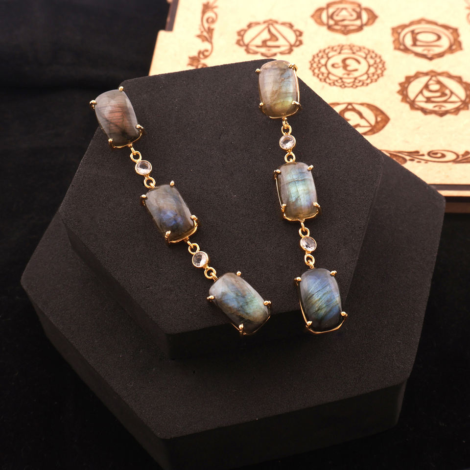 Pendiente de declaración de gran tamaño, labradorita llamativa genuina con delicado pendiente de gota de cuarzo de cristal, colgante de ajuste de punta chapada en oro