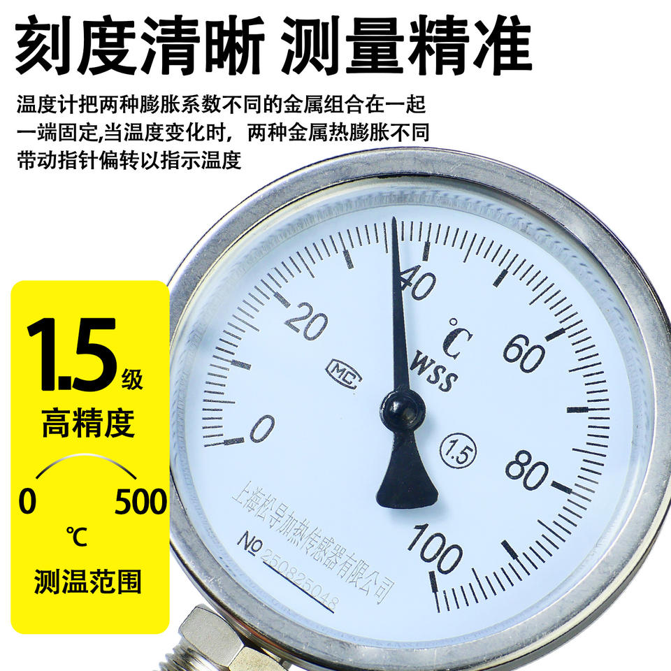 Termómetro bimetálico con puntero radial/axial para medición de temperatura industrial en tuberías y calderas WSS401/411