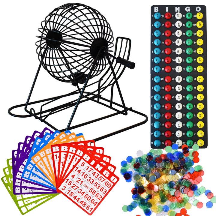 Juego de Bingo para Grupos Grandes y Fiestas, Jaula Redonda de Metal, 75 Bolas de Colores, 100 Tarjetas de Bingo, 500 Fichas Mixtas, Tablero Maestro