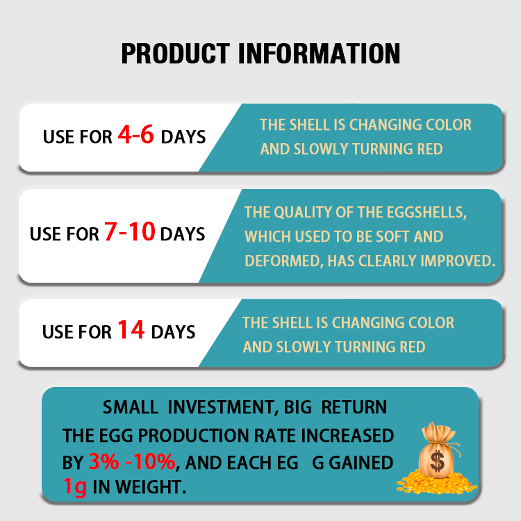 Application:prolong egg production peak, more eggs produce, egg color well....