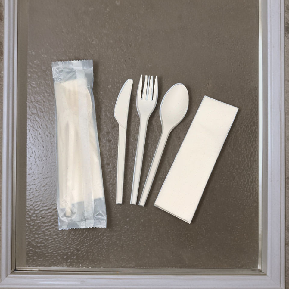 Cubiertos de plástico PLA compostables biodegradables, juegos de cubiertos desechables a granel, incluye cuchillo, cuchara, servilleta para uso en hoteles de aerolíneas