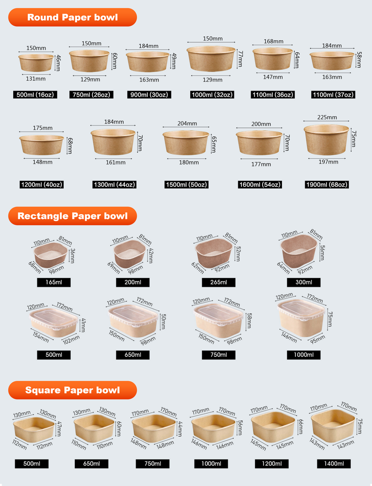 Tazón Rectangular Biodegradable Desechable de Papel Kraft para Sopa, 1090-1900 ml, con Tapa de Papel, Apto para Microondas, para Comida Caliente, para Llevar, Catering