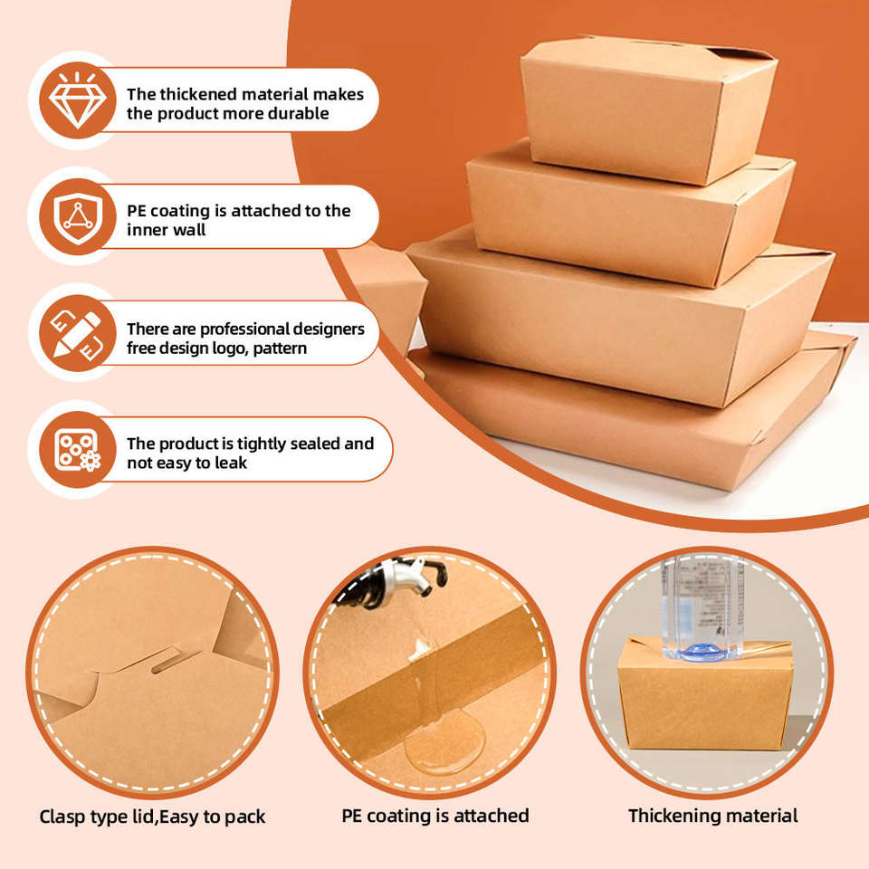 Caja de Papel Kraft Biodegradable, Contenedor Desechable para Alimentos con Tapa, Logotipo Personalizado en Relieve para Restaurantes, Servicios de Entrega y Catering