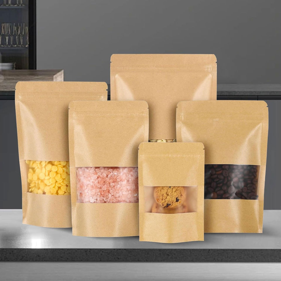 Bolsas de pie recicladas biodegradables personalizadas, embalaje de alimentos secos en bolsas de papel de cartón Kraft marrón, ventana translúcida
