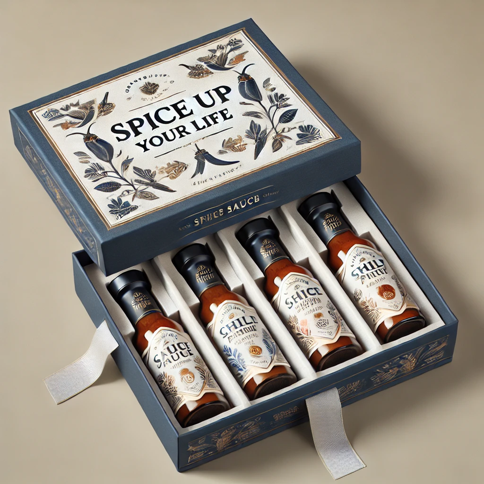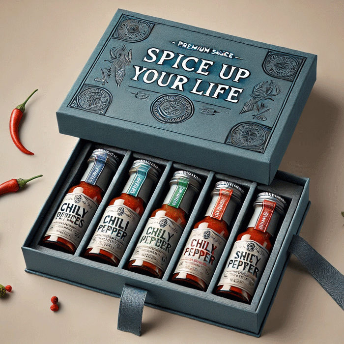 Caja de comida en relieve personalizada de lujo de cartón rígido biodegradable para salsa picante especias condimentos botella de vidrio embalaje