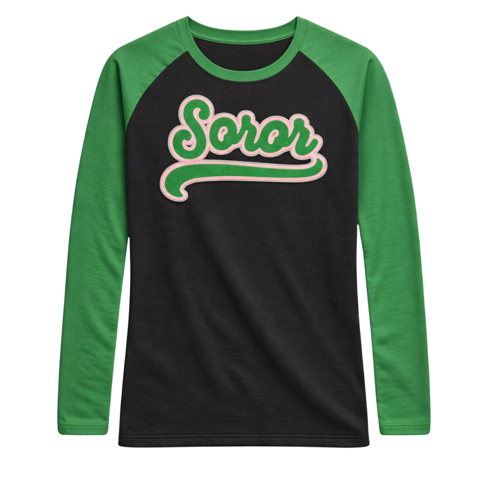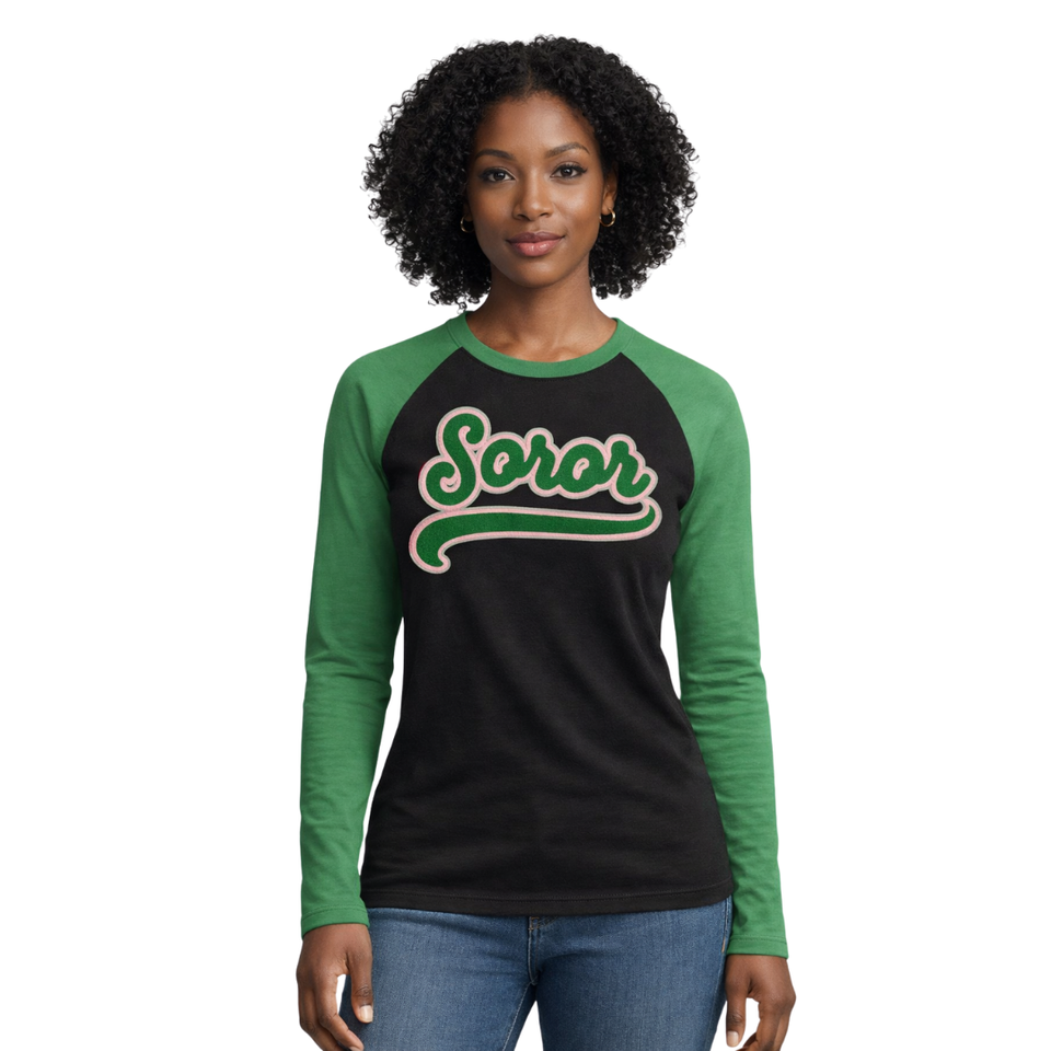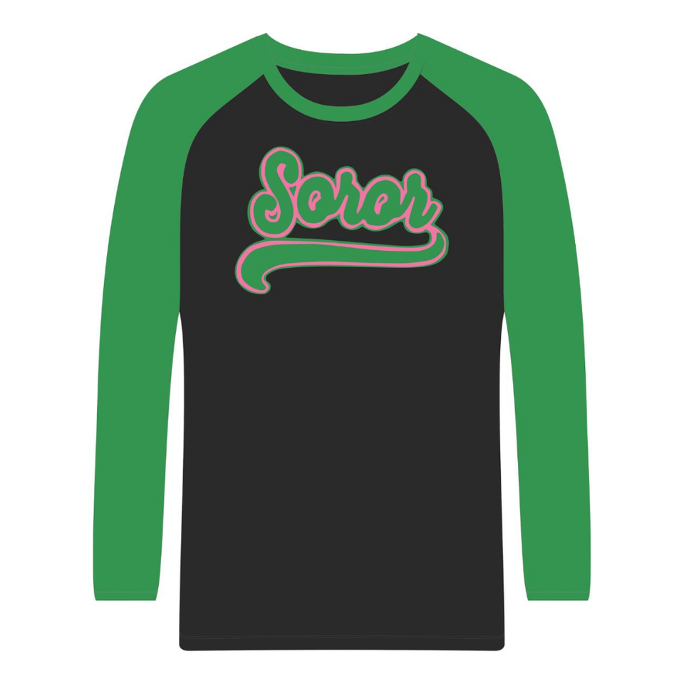 Camiseta Negra de Manga Larga Estilo Raglán 08 Soror, Camiseta Rosa y Verde para Mujeres de Hermandad Griega, Ropa Casual Elegante para Hermandad Universitaria
