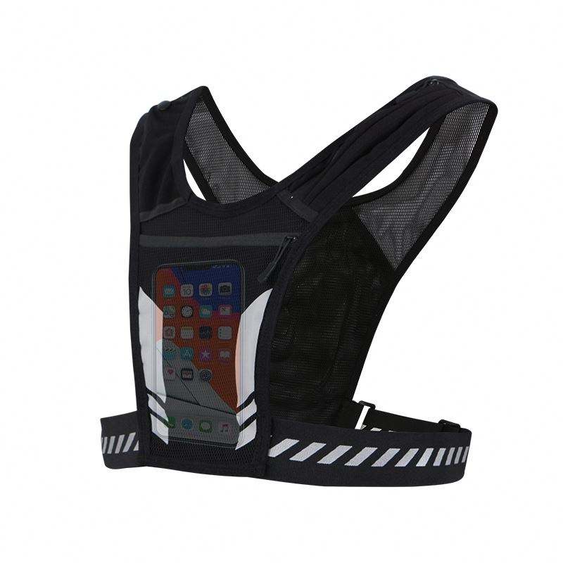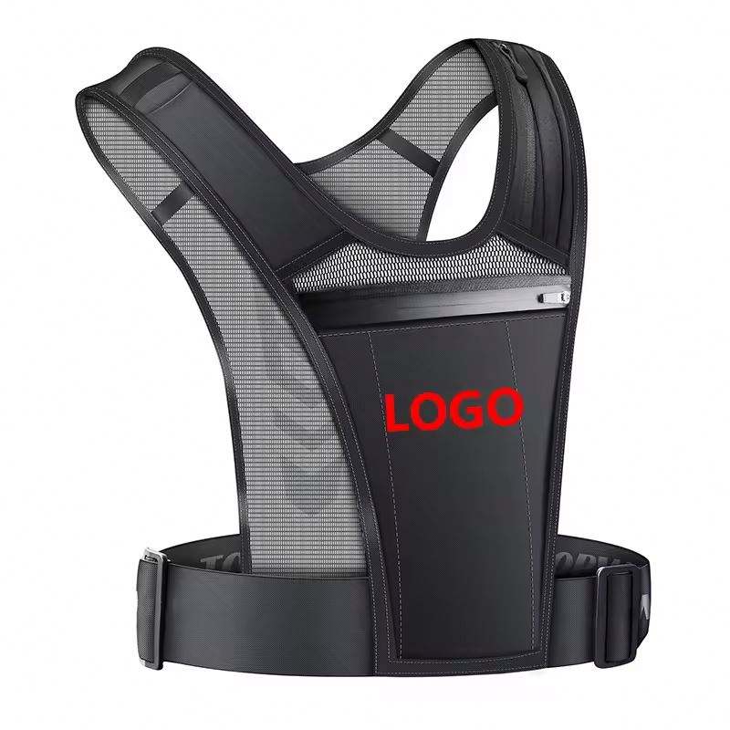 Chaleco Deportivo Transpirable Reflectante Negro Personalizado Ajustable para Entrenamiento y Correr con Soporte para Teléfono en el Pecho y Bolsillos para Botella
