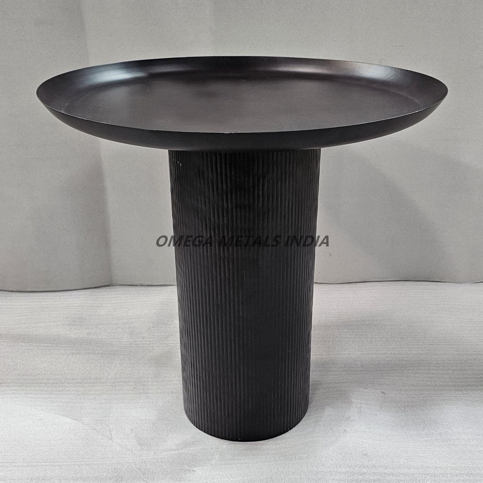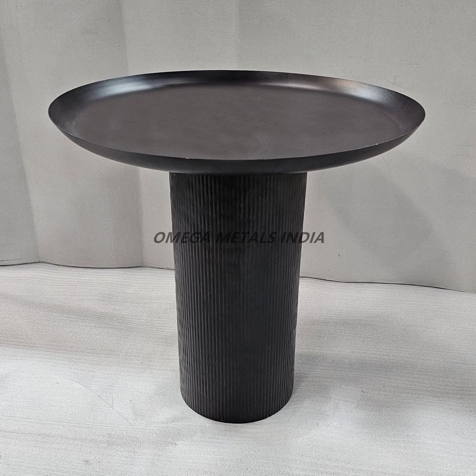 Mesa de centro negra con tapa estilo bandeja circular y fondo cilíndrico acanalado que combina funcionalidad y diseño contemporáneo