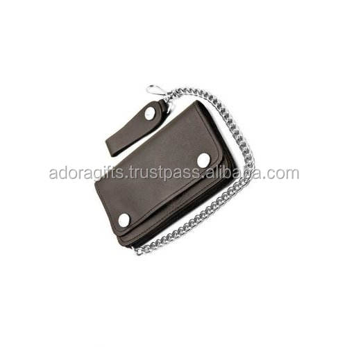 Cartera con cadena de cuero genuino para hombre, Cartera de motorista con cierre de botón, color negro