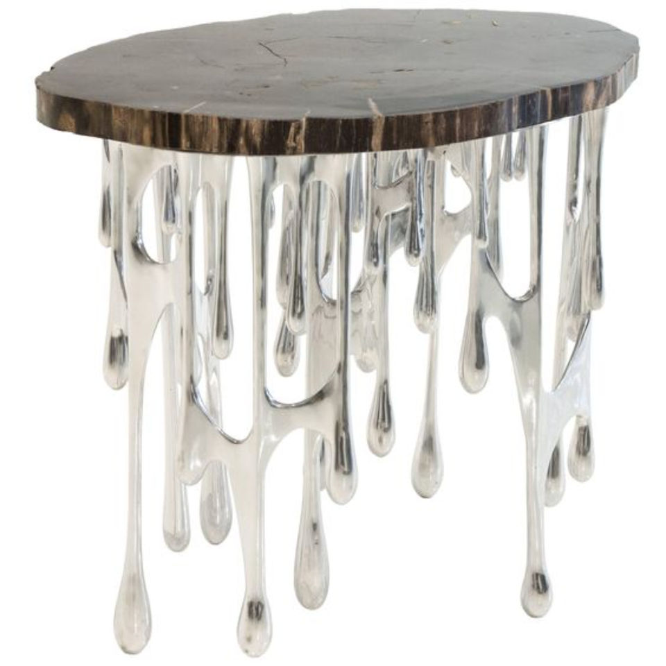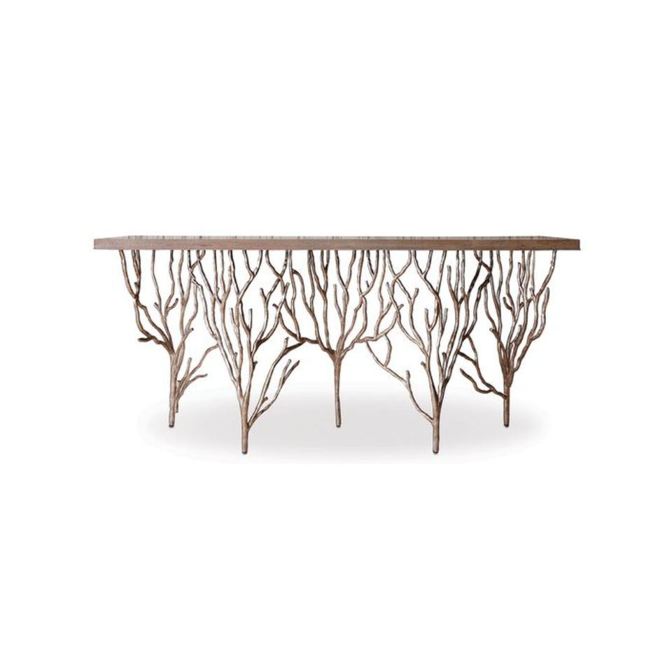 Mesa Consola de Metal de Primera Calidad con Recubrimiento en Polvo de Color Negro y Base de Diseño Único Chapada en Oro de Alta Calidad