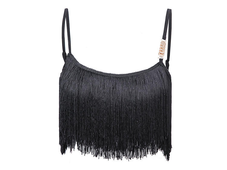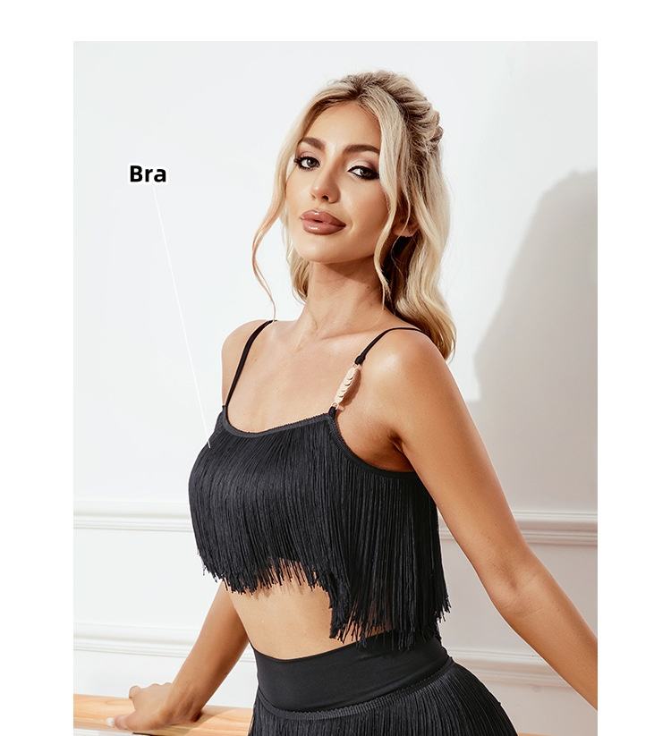 Top de baile latino con borlas de doble capa negra, traje de baile en barra de Salsa, sujetador de camisa para mujer