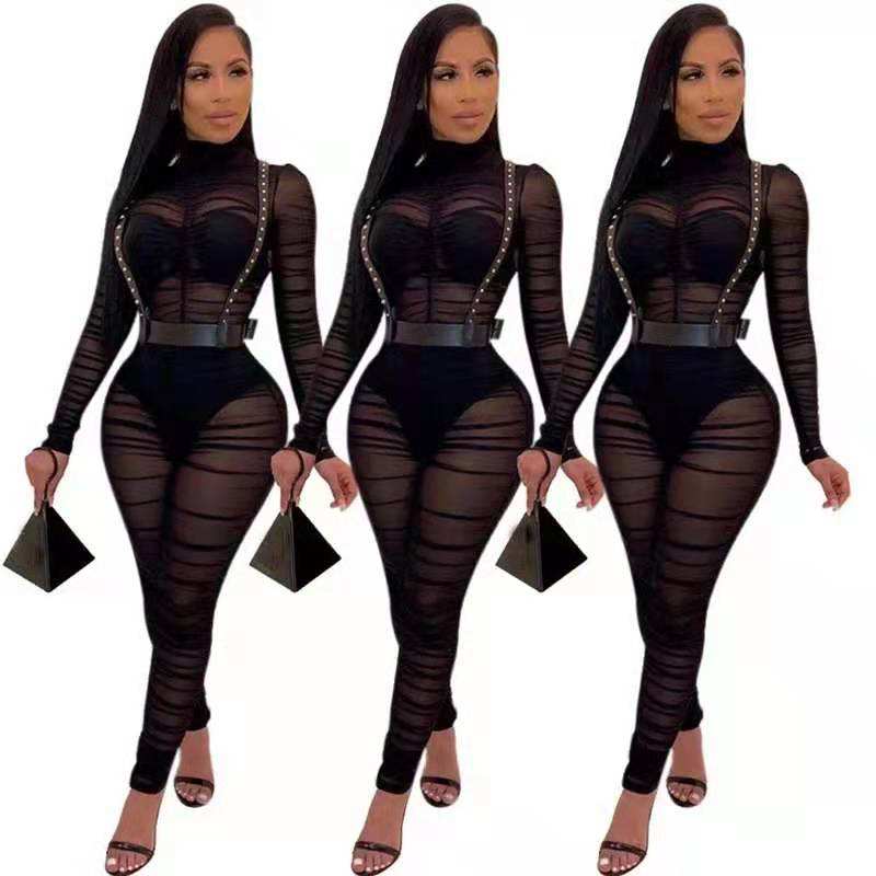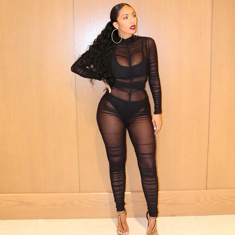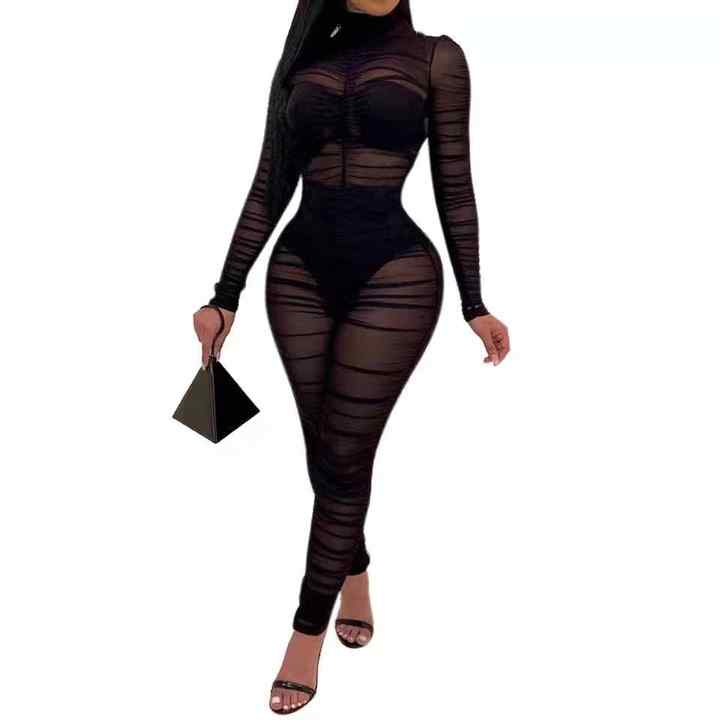 Mono Largo Negro de Malla Transparente con Escote Alto y Mangas Largas, Traje Transparente para Fiesta o Club, Mono Largo con Pantalones