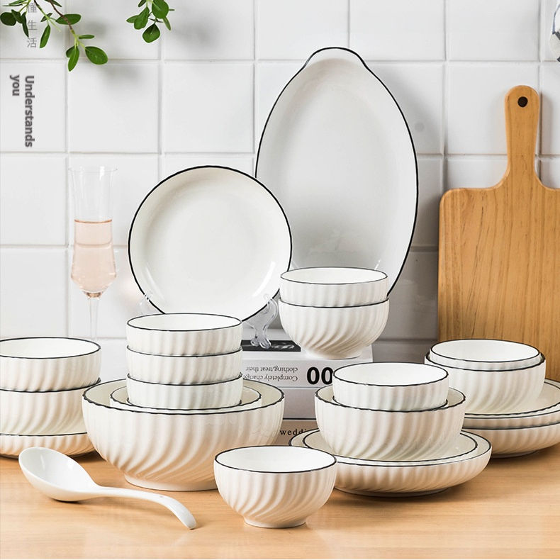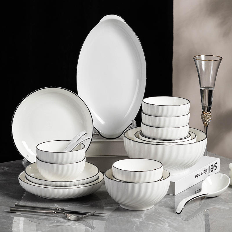 Juego de Vajilla de Cerámica con Borde Negro en Forma de Luna para Hogar, Hotel, Restaurante, Platos y Tazones