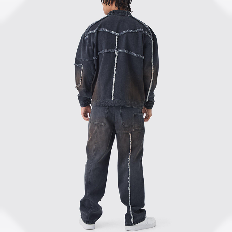 Chaqueta Moto Negra Oversize con Lavado Ácido y Efecto Desgastado, 100% Poliéster, Sin Cuello, con Patrón de Letras, Servicio OEM para Hombre
