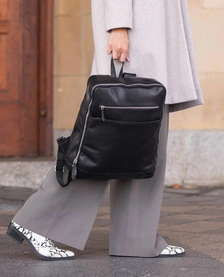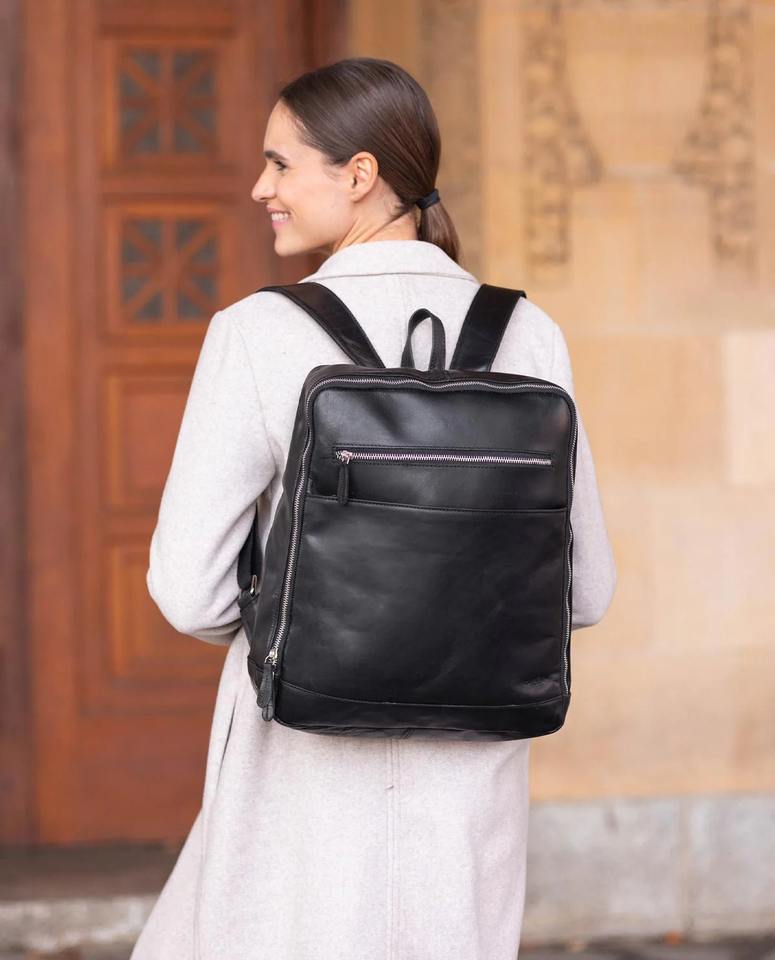 Mochila de Cuero Genuino Negro Resistente al Agua de Capacidad Media con Correa para Hombres y Mujeres, para Portátil, Escuela, Viajes, Universidad, Trabajo