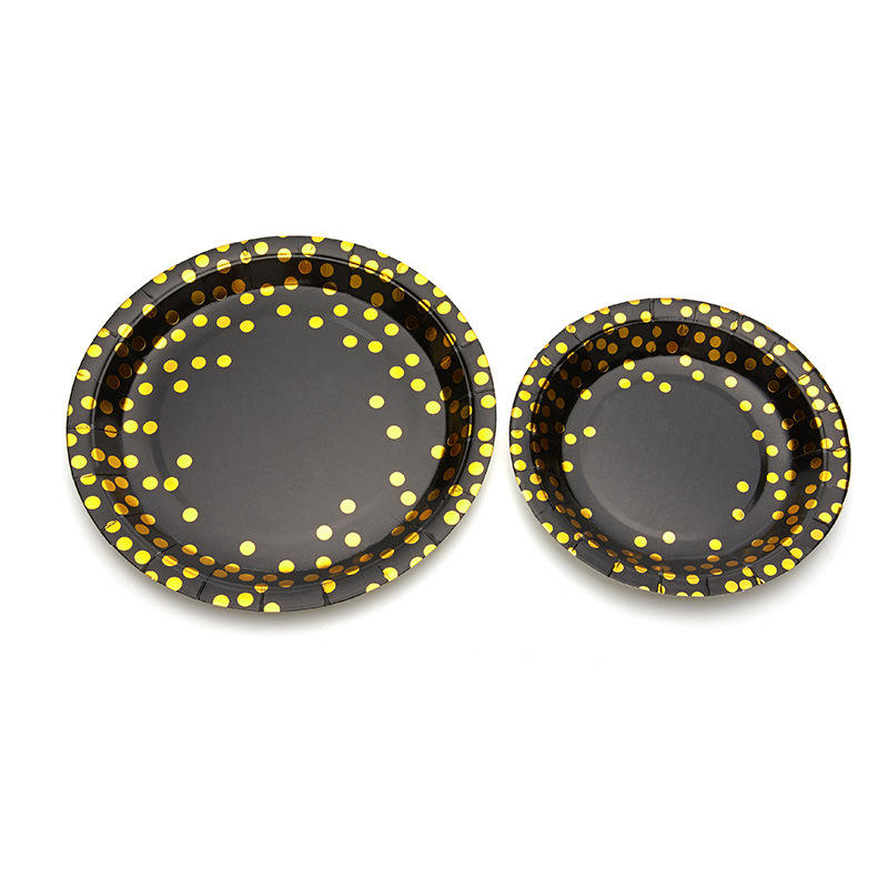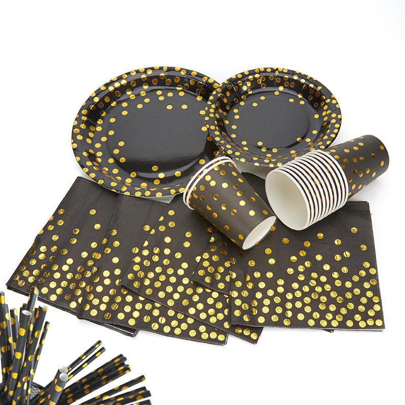 Black Gold Dot Design Tableware Set Disposable Paper Plates Cups Napkins Straws Party Tableware Set