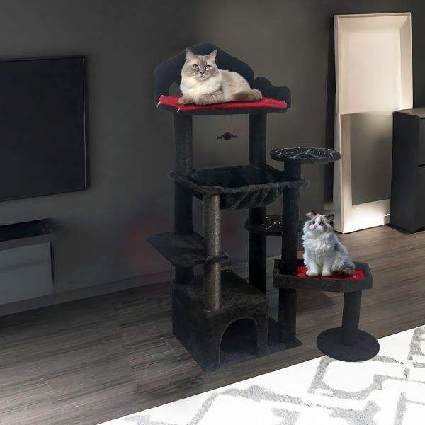 Árbol para Gatos Gótico Negro de Múltiples Niveles, con Postes para Rascar, Perchas, Hamaca y Cueva