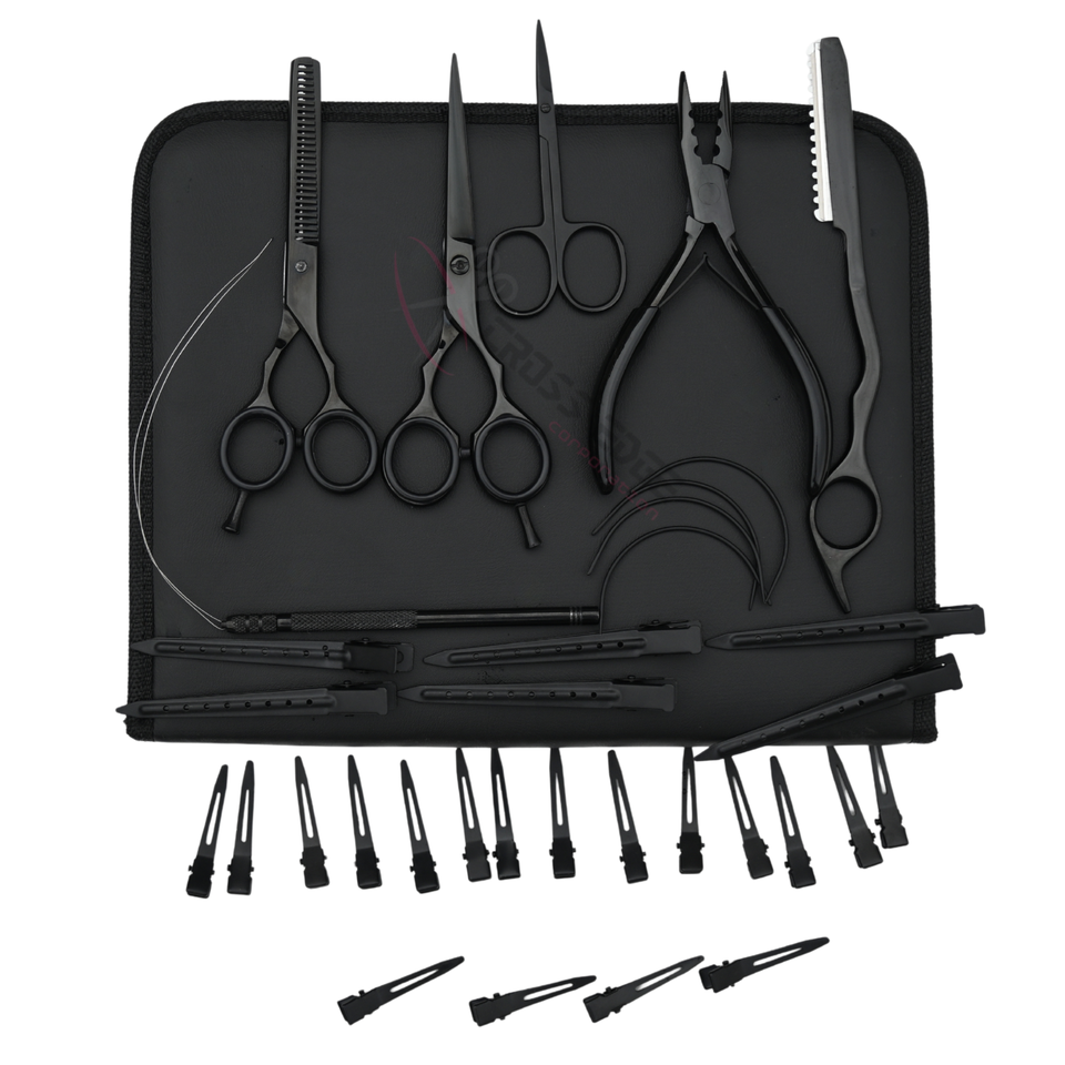 Kit de herramientas para extensiones de cabello negro, alicates de crimpado Micro Link, tijeras para cortar cabello, cuchilla para entresacar cabello, agujas curvas y pinzas para el cabello
