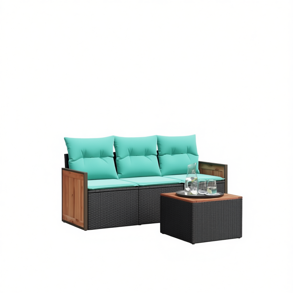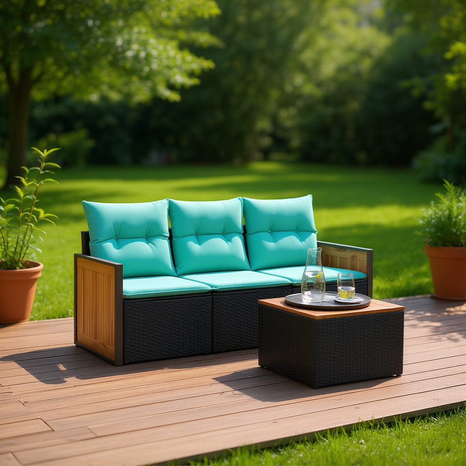 Conjunto de Sofá de Jardín de Ratán Sintético Negro de 3 Plazas con Cojines, Estructura de Madera de Teca, Diseño Contemporáneo, Muebles de Exterior