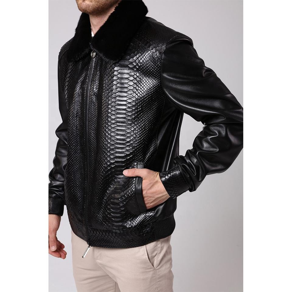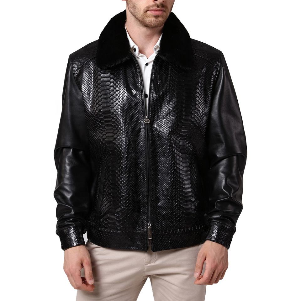 Chaqueta de piel de pitón negra para hombre, Cazadora Bomber de cuero con relieve de piel de serpiente, con cuello Rex desmontable