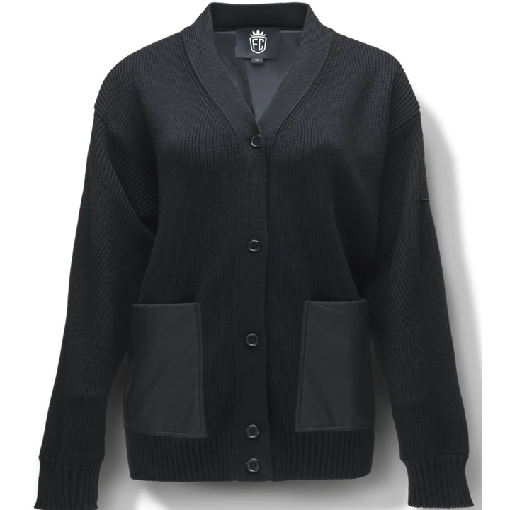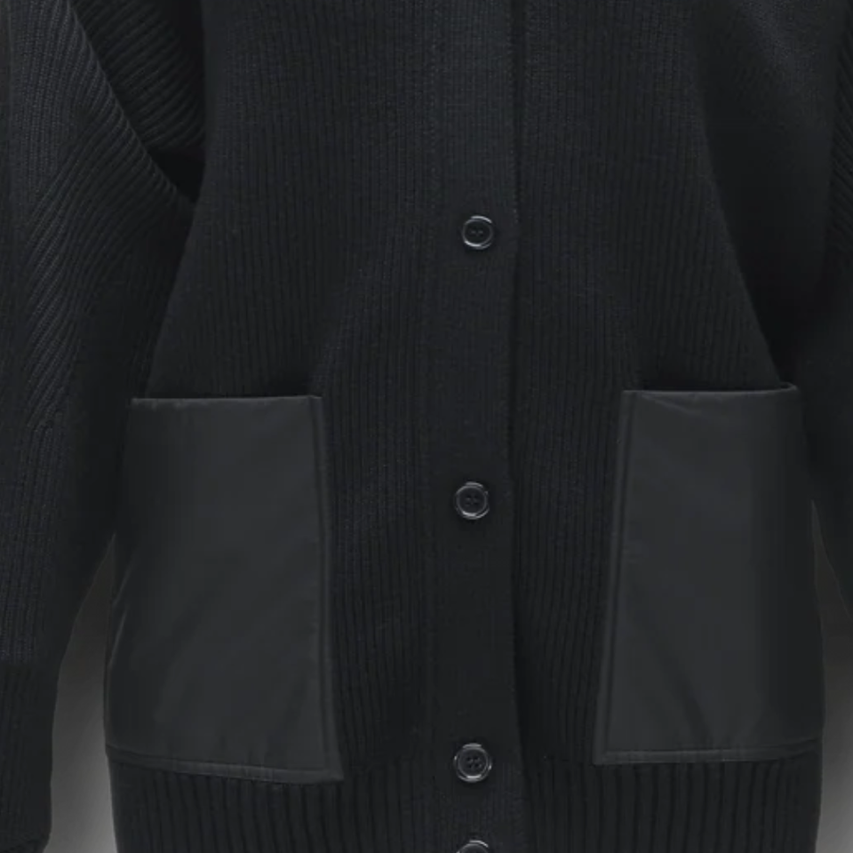 Cárdigan Negro de Punto Acanalado para Mujer, Suéter Largo con Botones en la Parte Delantera y Bolsillos de Parche, Estilo Moderno y Minimalista para Invierno