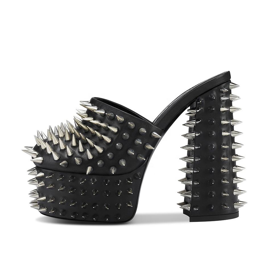 Zapatos de mulas de plataforma de tacón alto grueso cerrado con tachuelas negras para mujeres tacones de Punta únicos
