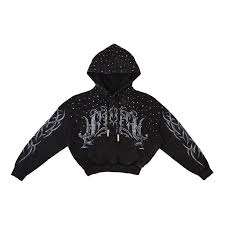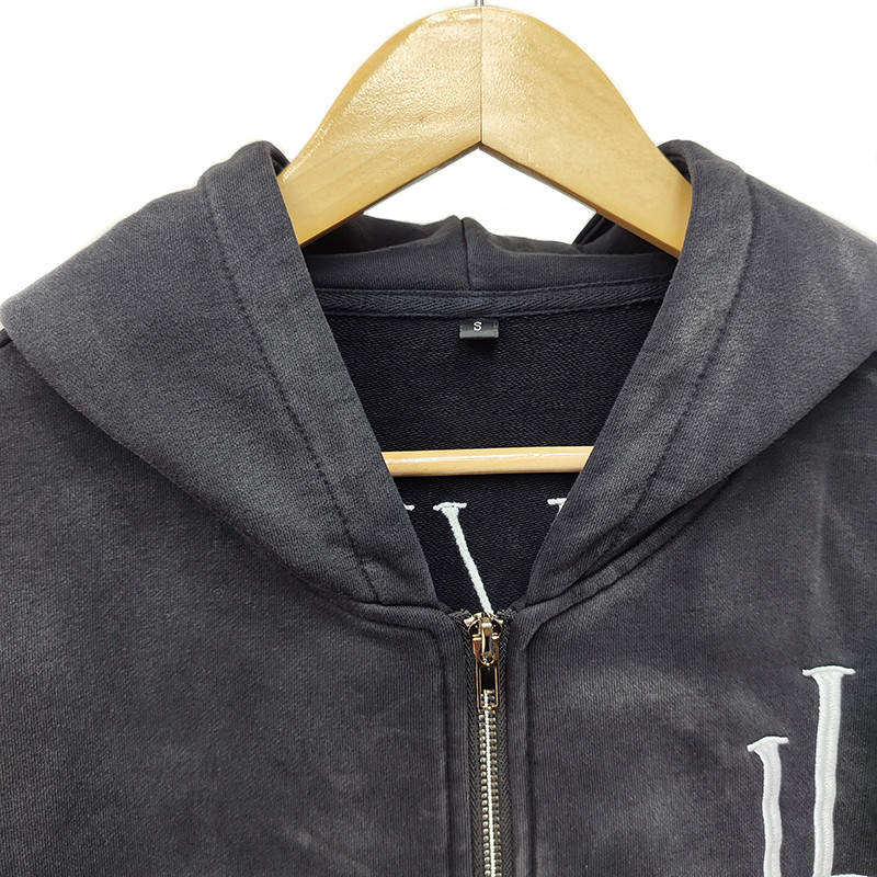 Sudadera con capucha corta vintage negra con estampado serigrafiado, lavado enzimático, bordado, cremallera, OEM, personalizada, con lavado ácido y estilo francés.