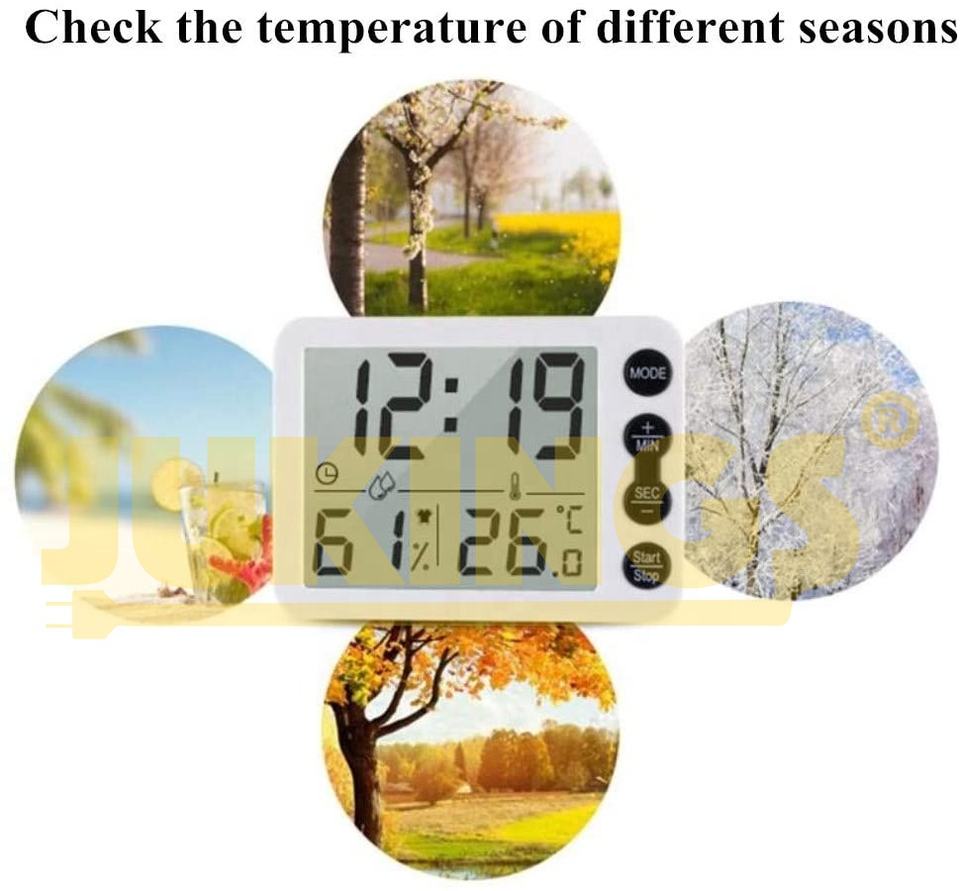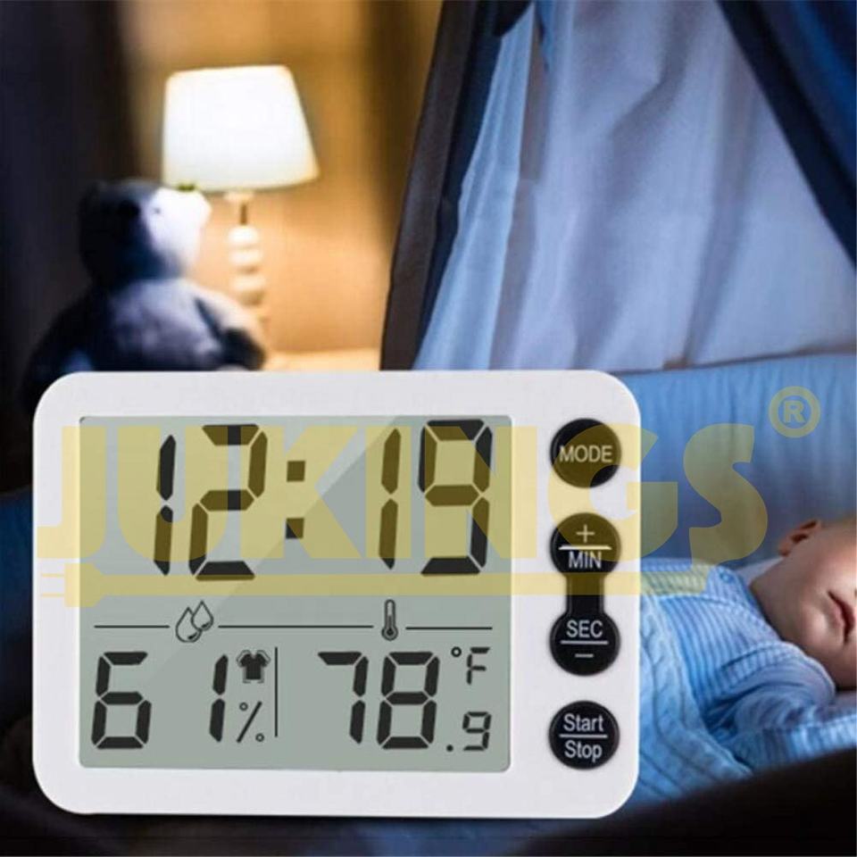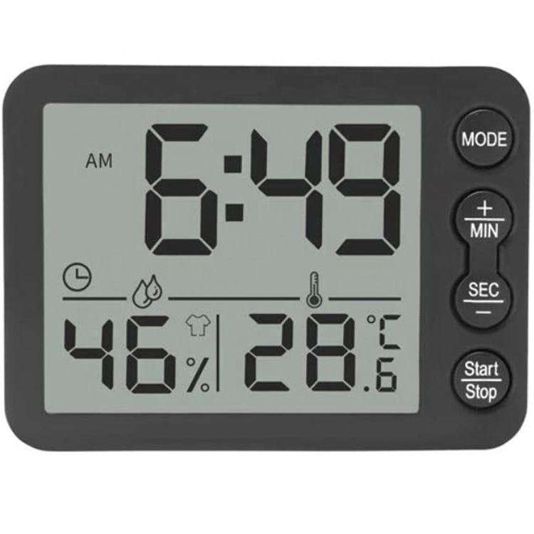 Termómetro Higrómetro Digital LCD Negro con Reloj, Alarma, Temporizador, Multifunción, Monitor de Temperatura y Humedad en °C/°F, Carcasa Electrónica