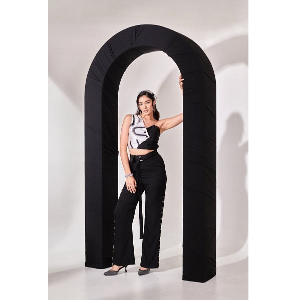 Conjunto de Dos Piezas para Mujer, Top Negro con Pantalón Recto con Pedrería, Atuendo Elegante con Detalles Brillantes, Look Moderno