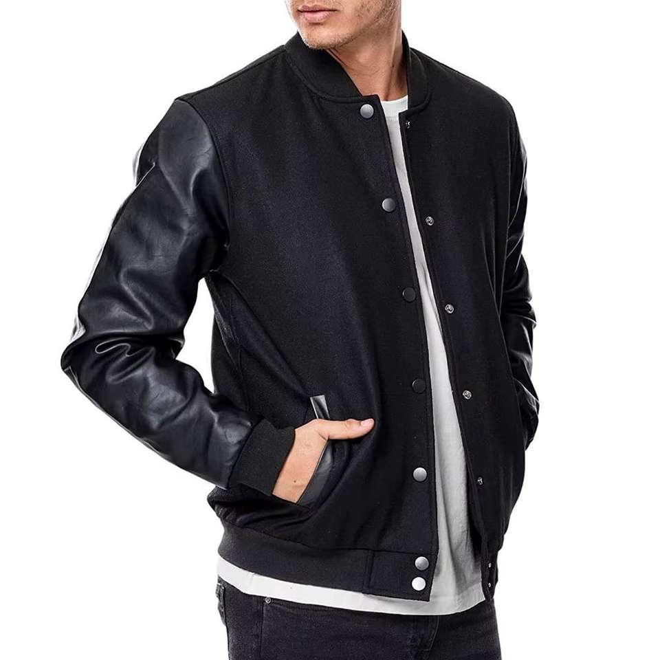 Chaqueta Universitaria Negra con Mangas de Cuero Sintético, Estilo Béisbol, Unisex, con Botones, Ribete Acanalado, Opción de Logotipo Personalizado, Prenda Exterior Abrigada