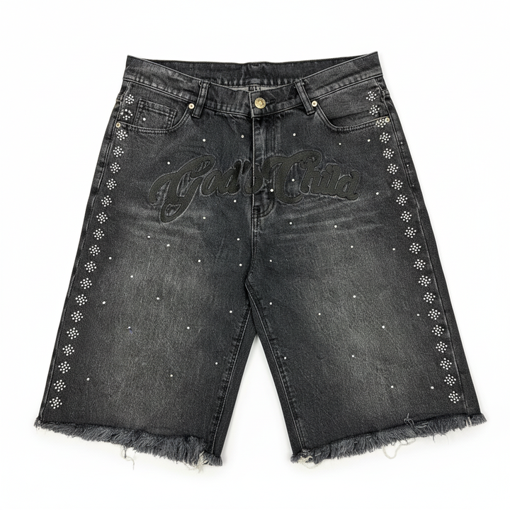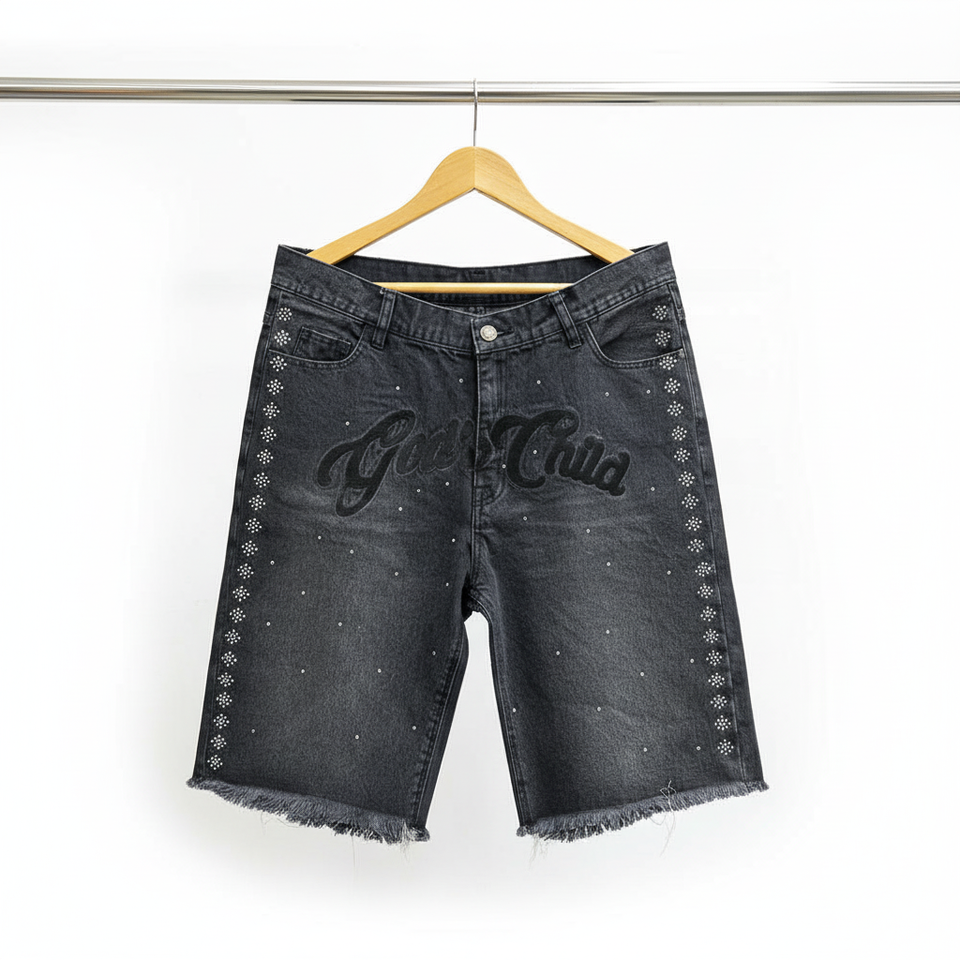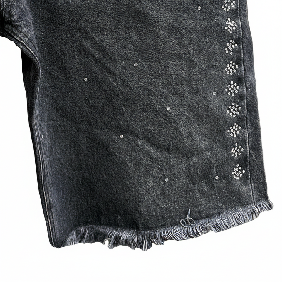 Shorts de mezclilla negros lavados con pedrería, bordado personalizado, tachuelas, dobladillo deshilachado, estilo urbano, casuales, para hombre y mujer
