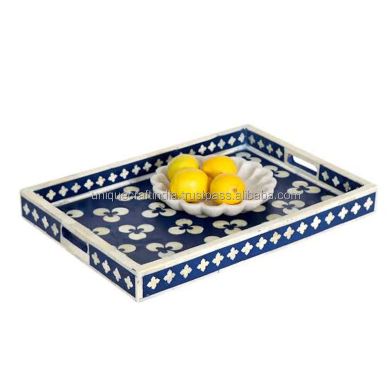 Bandeja Rectangular Decorativa Hecha a Mano con Incrustaciones Geométricas de Hueso Blanco y Negro, Base de Madera de Lujo, Diseño Artesanal, Decoración del Hogar
