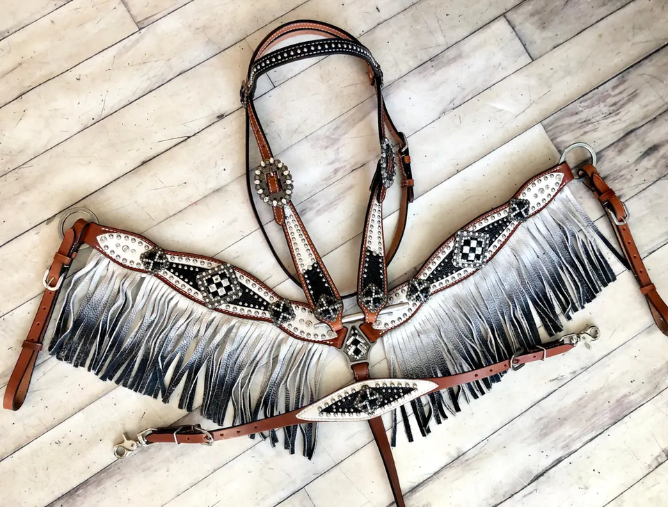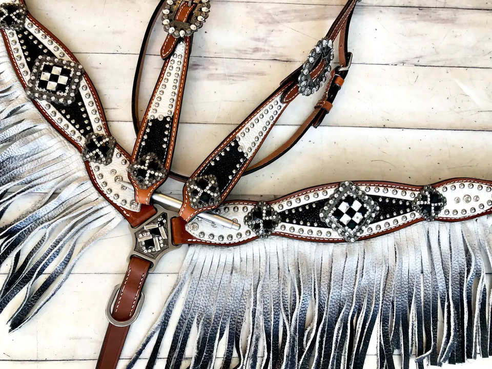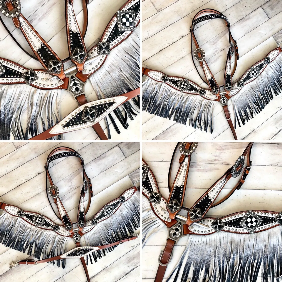 EquiElite Exports - Juego de arreos de cuero con diseño de cuadros en blanco y negro, con conchos y bordes festoneados, para caballo occidental, cabezada, pechera, personalizado