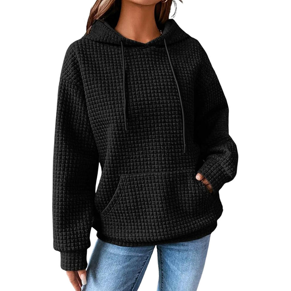 Sudadera con Capucha para Mujer, Negra, Invierno, Casual, Manga Larga, con Cordón, Estilo Waffle, Holgada, con Bolsillo Delantero, Cuero GK