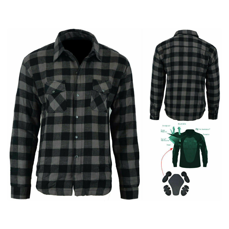 Camisa de Motocicleta de Algodón Transpirable a Cuadros Negros y Grises, Personalizable, Completamente Forrada en Zonas de Impacto, Protección con Armadura CE Extraíble para