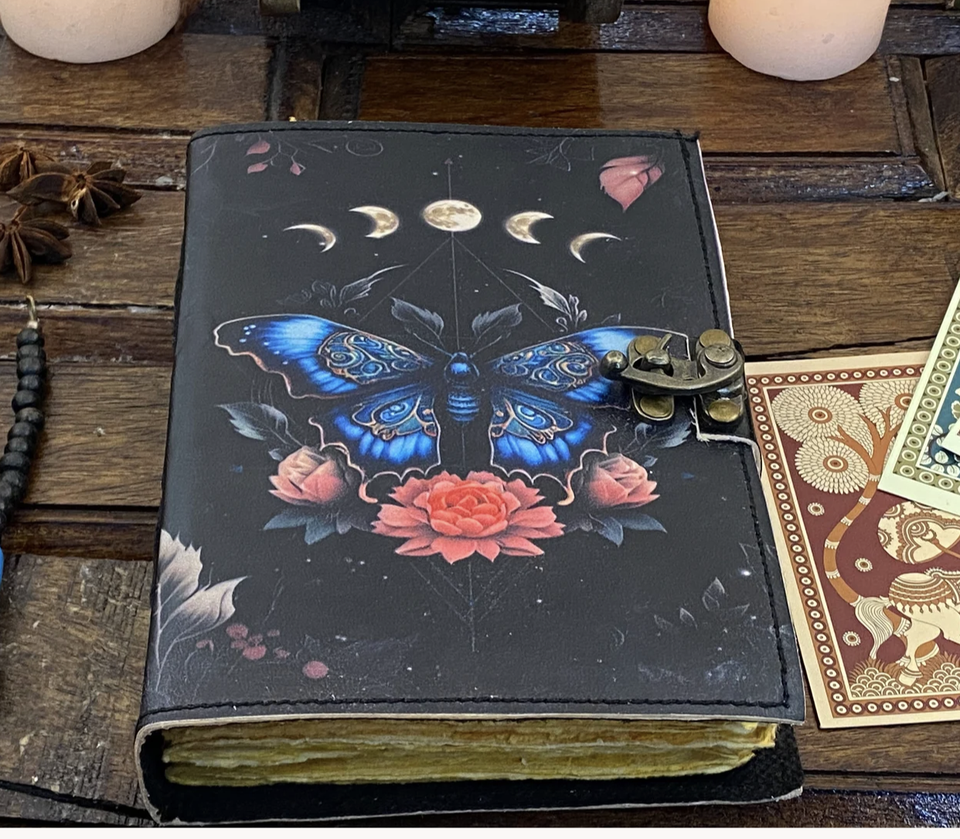 Cuaderno de hechizos en blanco, diario de sombras, con cierre de broche, de cuero vintage hecho a mano, tapa dura, con estampado de mariposas Morpho y polillas Luna en acuarela