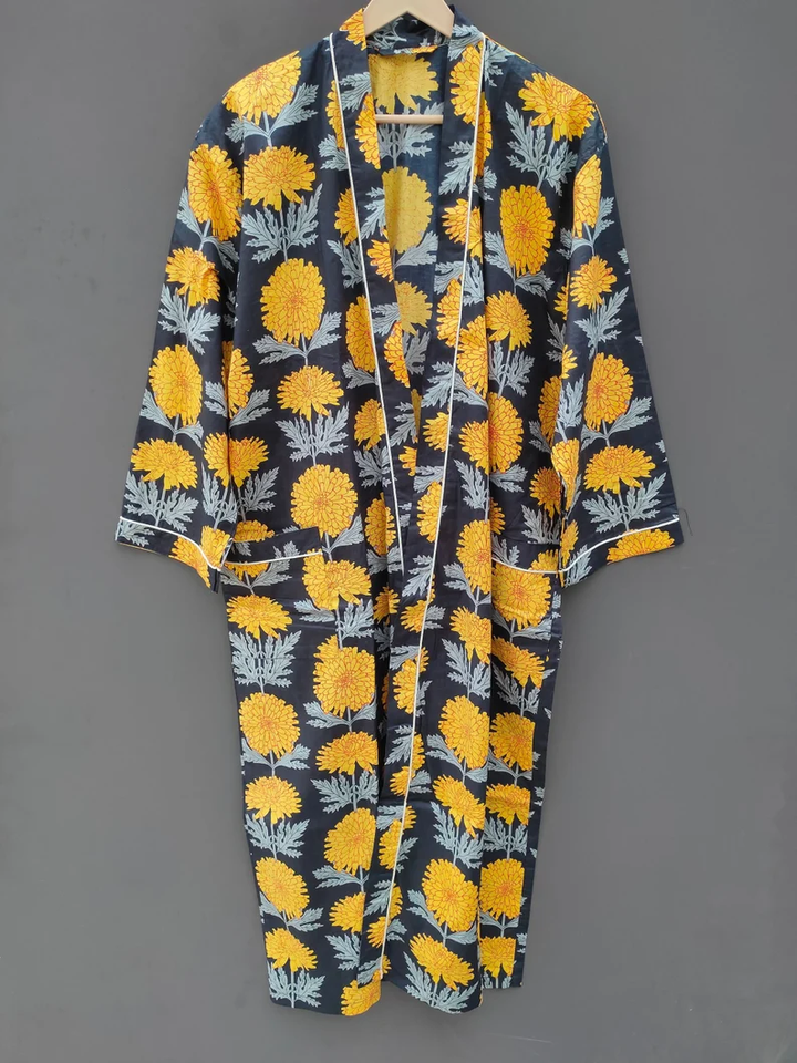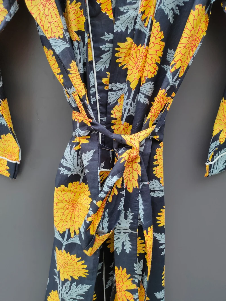 Bata Kimono de Algodón 100% Tejido Transpirable con Estampado de Dibujos Animados para Mujer, Camisón de Verano Hecho a Mano ODM con Cuello en V y Cintura Elástica hasta la Rodilla