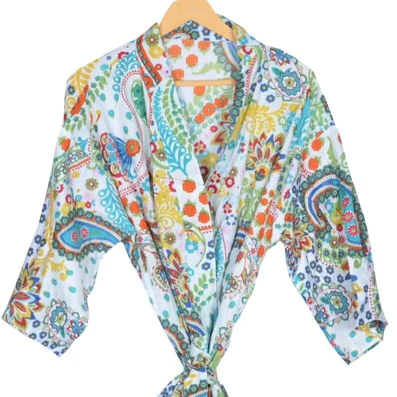 Bata Kimono de Algodón Suave con Estampado de Dibujos Animados para Mujer, Camisón de Verano Hecho a Mano ODM con Cuello en V y Cintura Elástica de Longitud Completa
