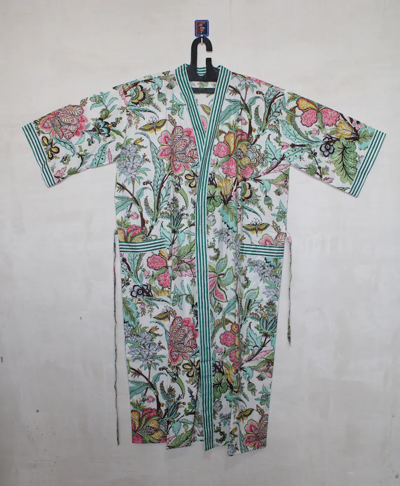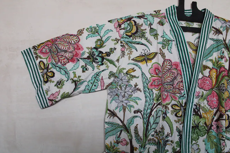 Bata Kimono con Estampado de Dibujos Animados para Mujer, 100% Algodón, Suave y Transpirable, Camisón de Verano Hecho a Mano, Cuello en V, Cintura Elástica, Largo Completo