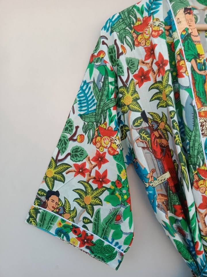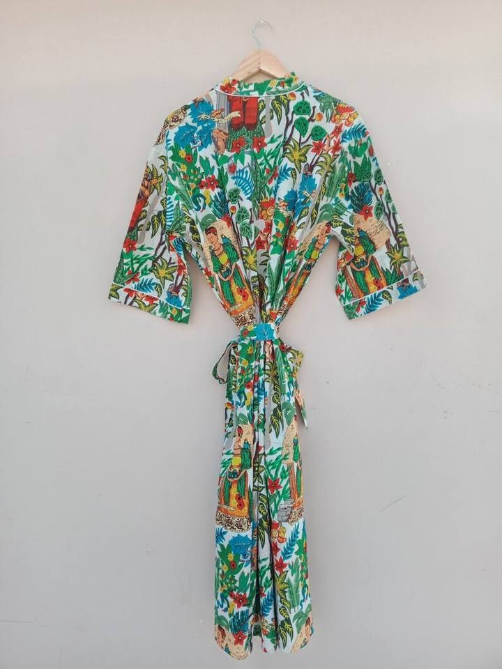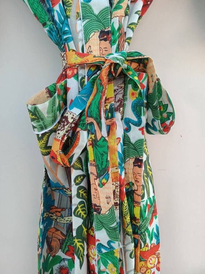 Bata Kimono de Algodón Suave y Transpirable con Estampado de Dibujos Animados para Mujer, Camisón de Verano Hecho a Mano ODM con Cuello en V, Cintura Elástica y Largo hasta la Rodilla